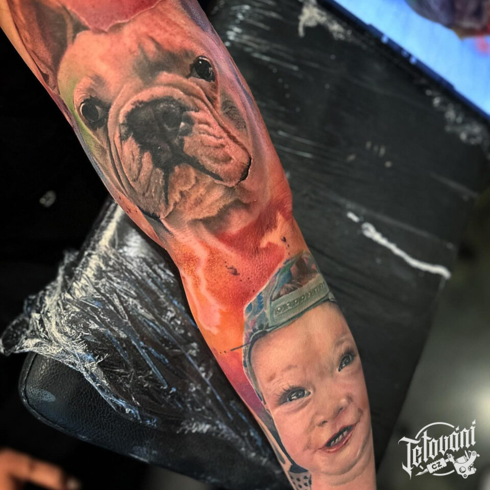 Tetování portrét dítěte a pes na ruku