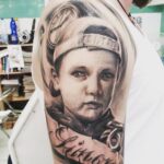 Tetování portrét dítěte se jménem na rameni