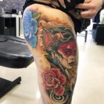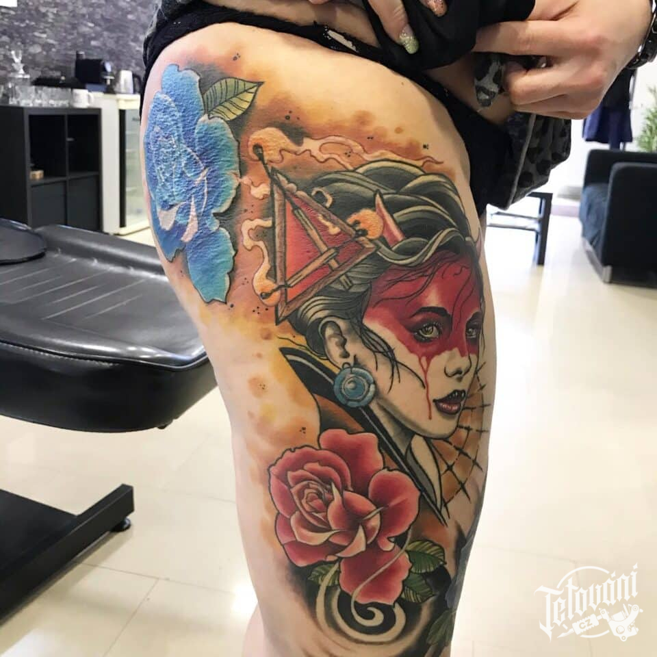 Tetování portrét gejša na stehno