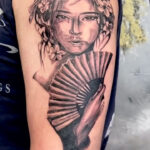 Tetování portrét gejši držící vějíř v ruce na rameni