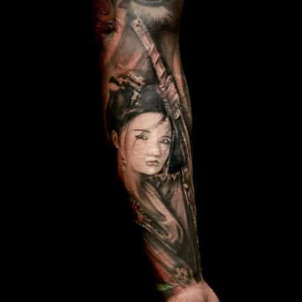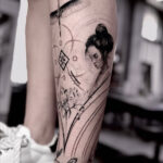 Tetování portrét gejši, květina, čáry, ornamenty na holeni