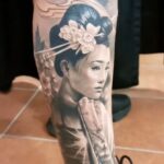 Tetování portrét Gejši, mýtické bytosti, drak, květiny a bojovník na noze