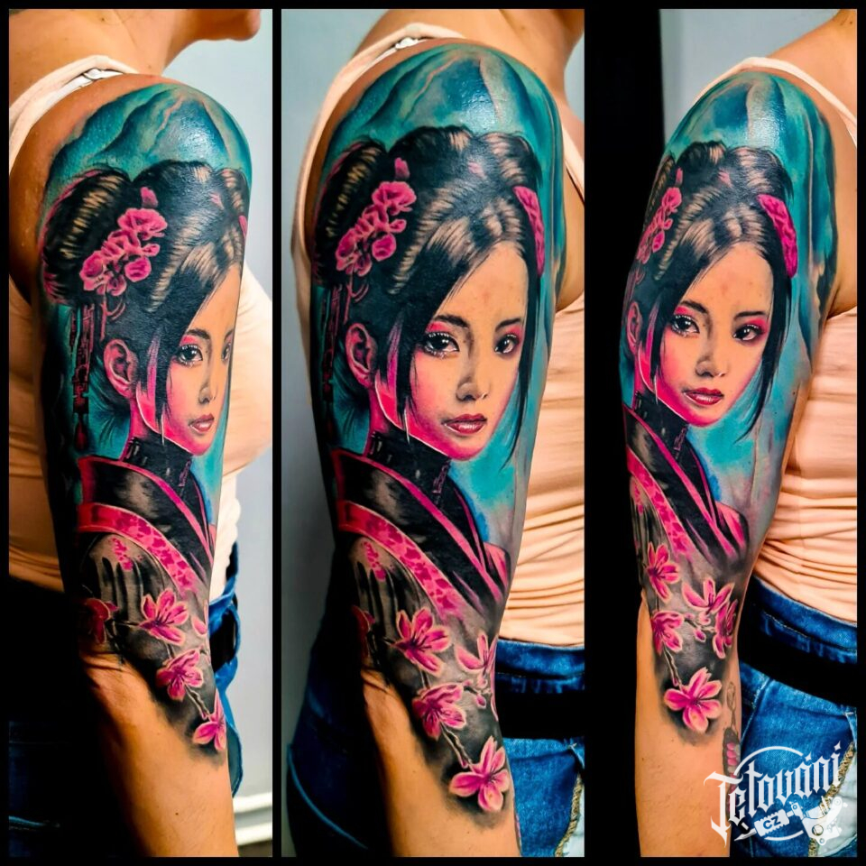 Tetování portrét gejši na rameno