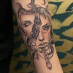 Tetování portrét Medúsy,mýtická bytost, žena na předloktí