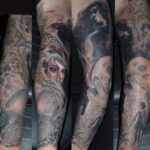 Tetování portrét, havran, vlk, měsíc na rukávu