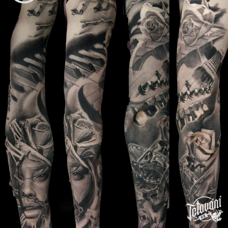 Tetování portrét, hudba, kytara růže na rukávu