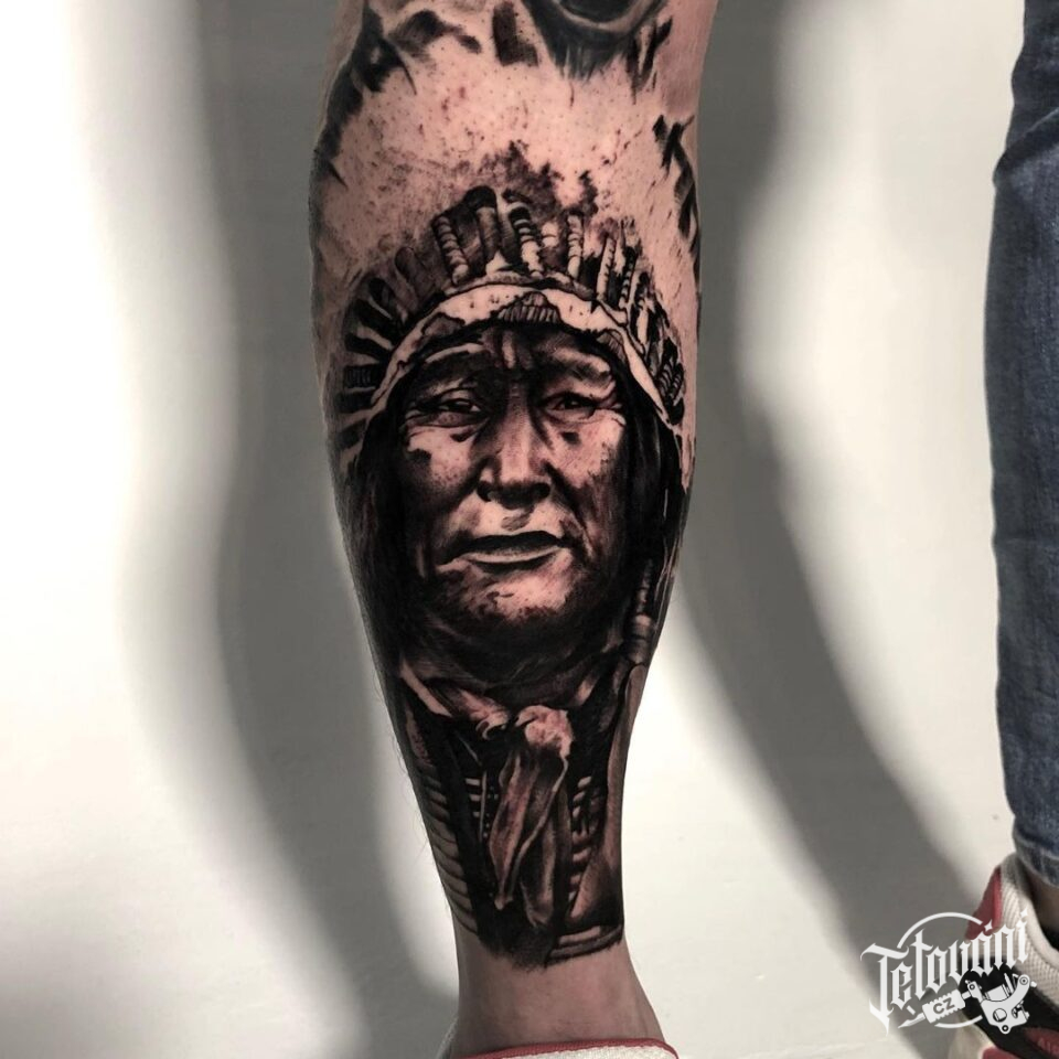 Tetování portrét indiána na holeni