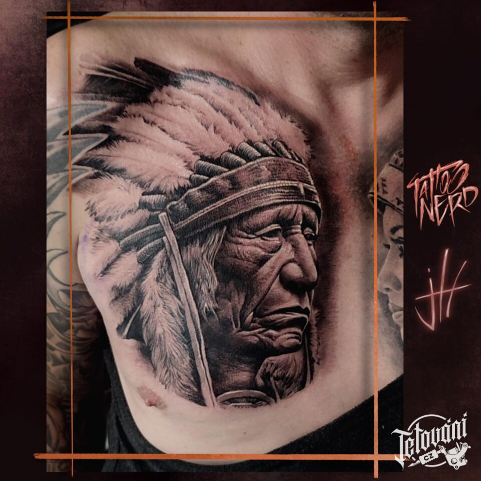Tetování portrét indiána na hrudi