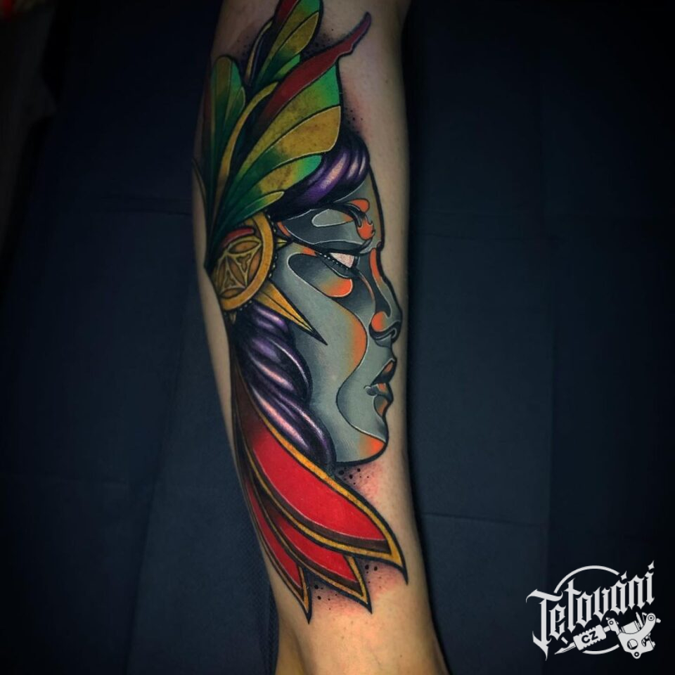 Tetování portrét indiánka na holeň