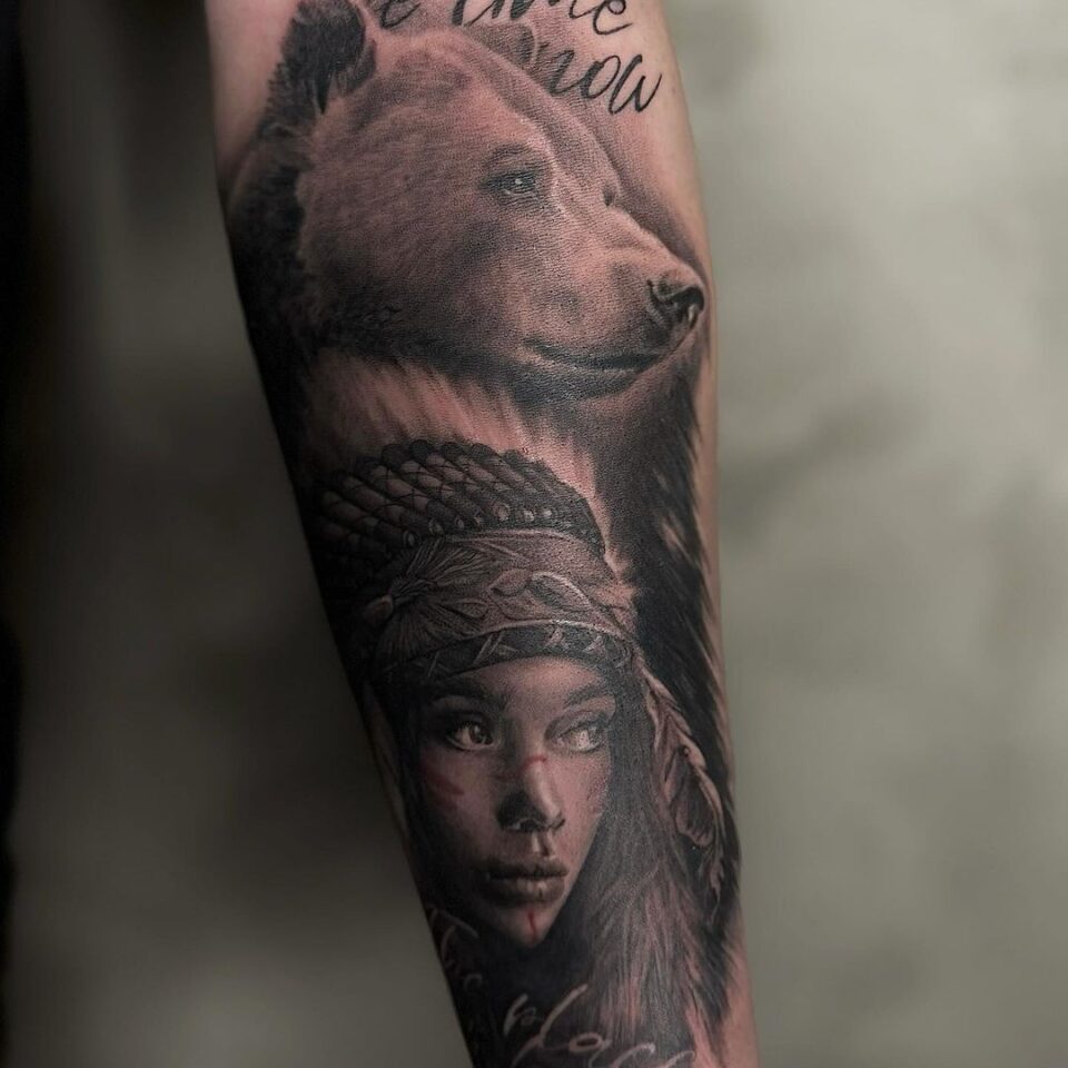 Tetování portrét indiánky a zvířete medvěda na předloktí