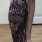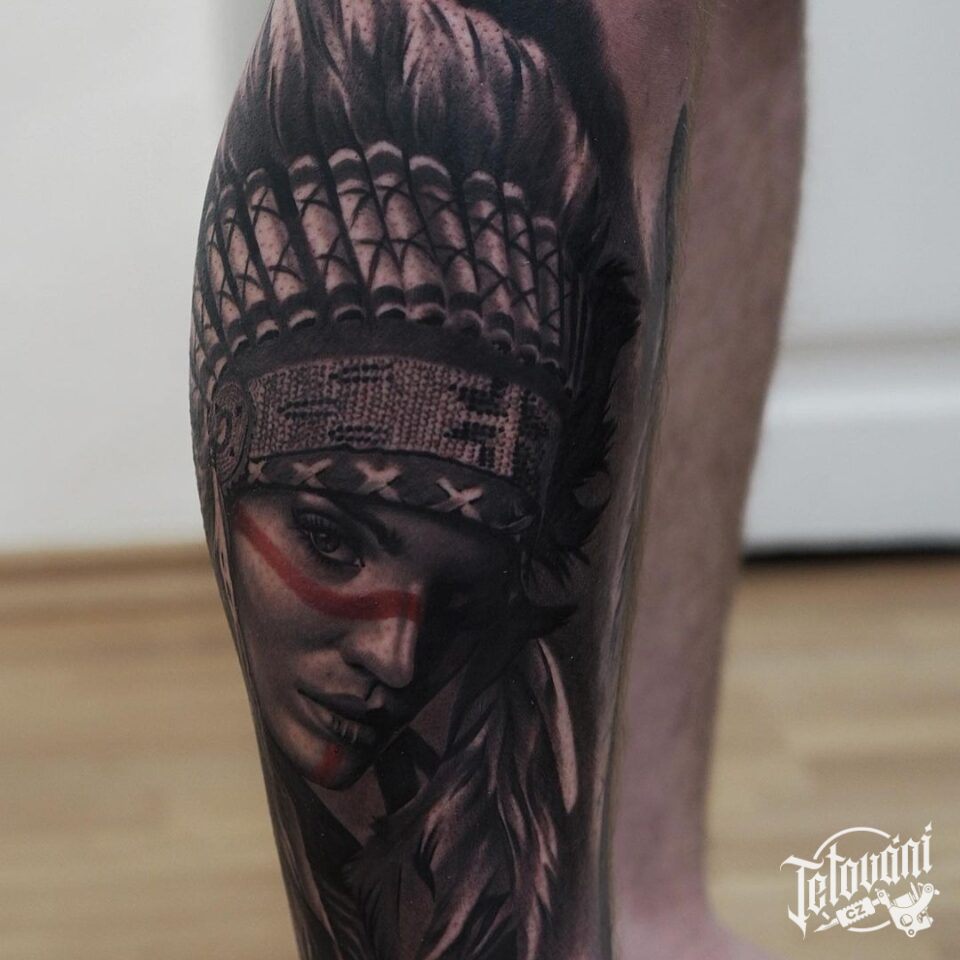 Tetování portrét indiánky na lýtku