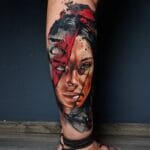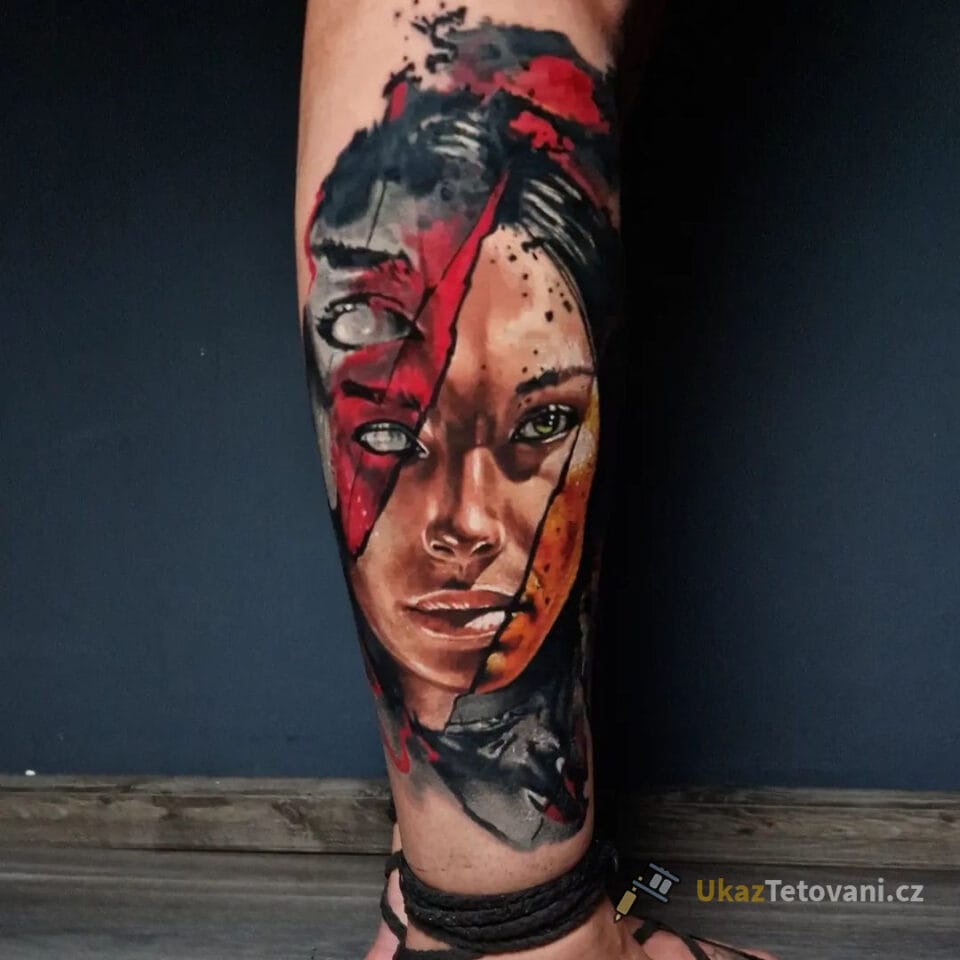 Tetování portrét indiánky s pírkem na lýtko