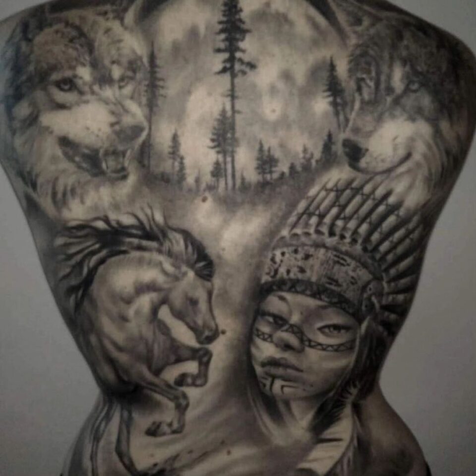 Tetování portrét indiánky s vlkem a koněm, zvířata, příroda les na záda