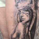 Tetování portrét indiánky s vlkem na boku stehna