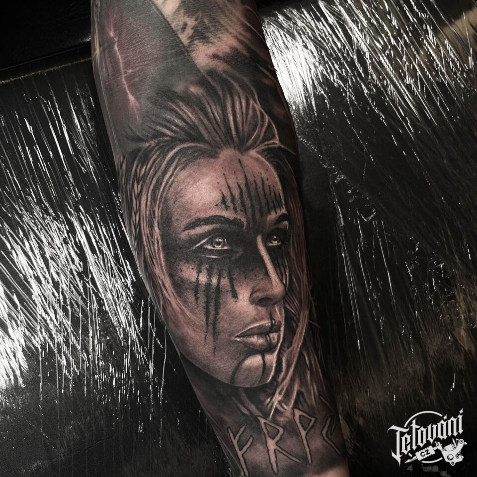 Tetování portrét indiánské ženy na předloktí