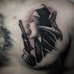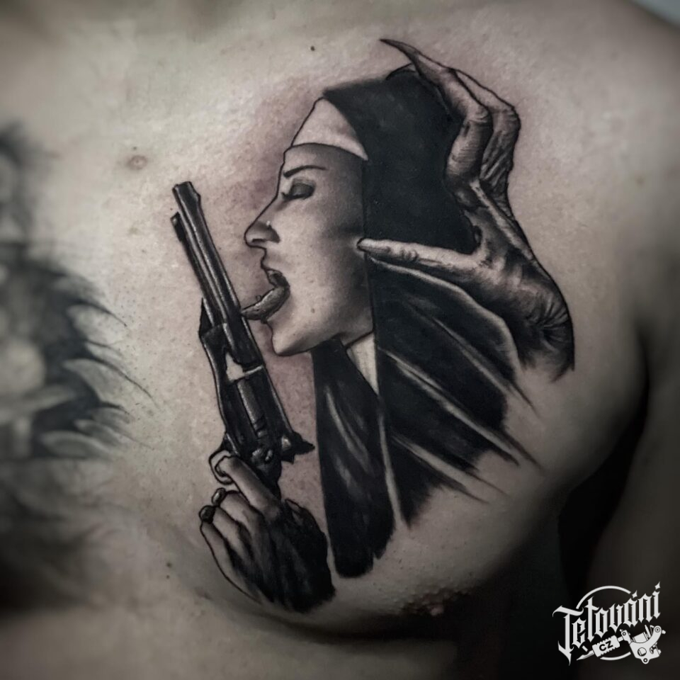 Tetování portrét jeptišky, ruka, předmět, pistole na hrudi