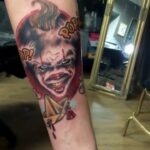 Tetování portrét klauna, nápisy na předloktí
