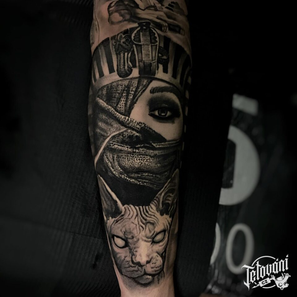 Tetování portrét Kleopatry, mytologie, zvíře kočka na předloktí