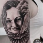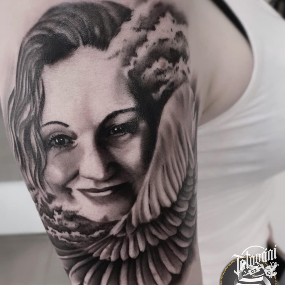 Tetování portrét, křídlo na paži