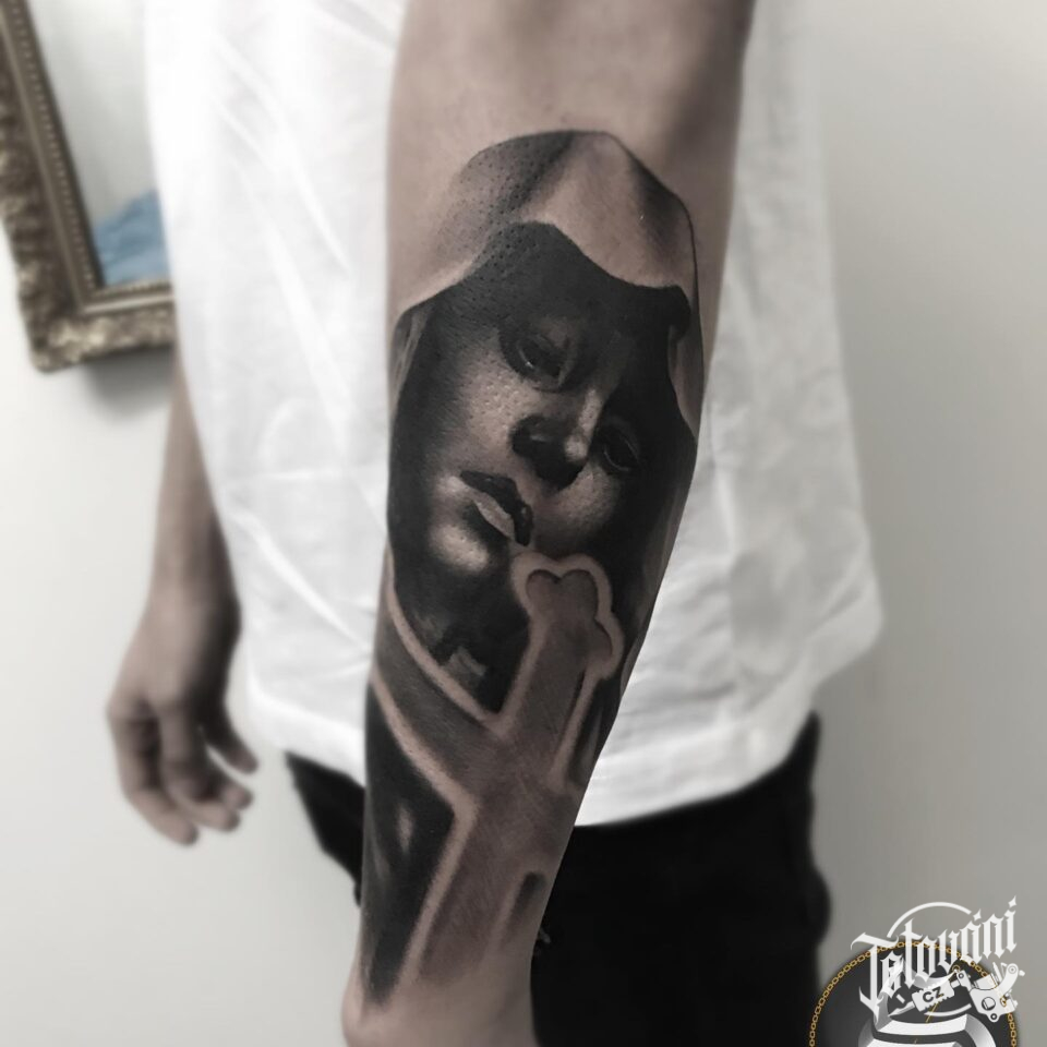 Tetování portrét, kříž na předloktí