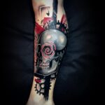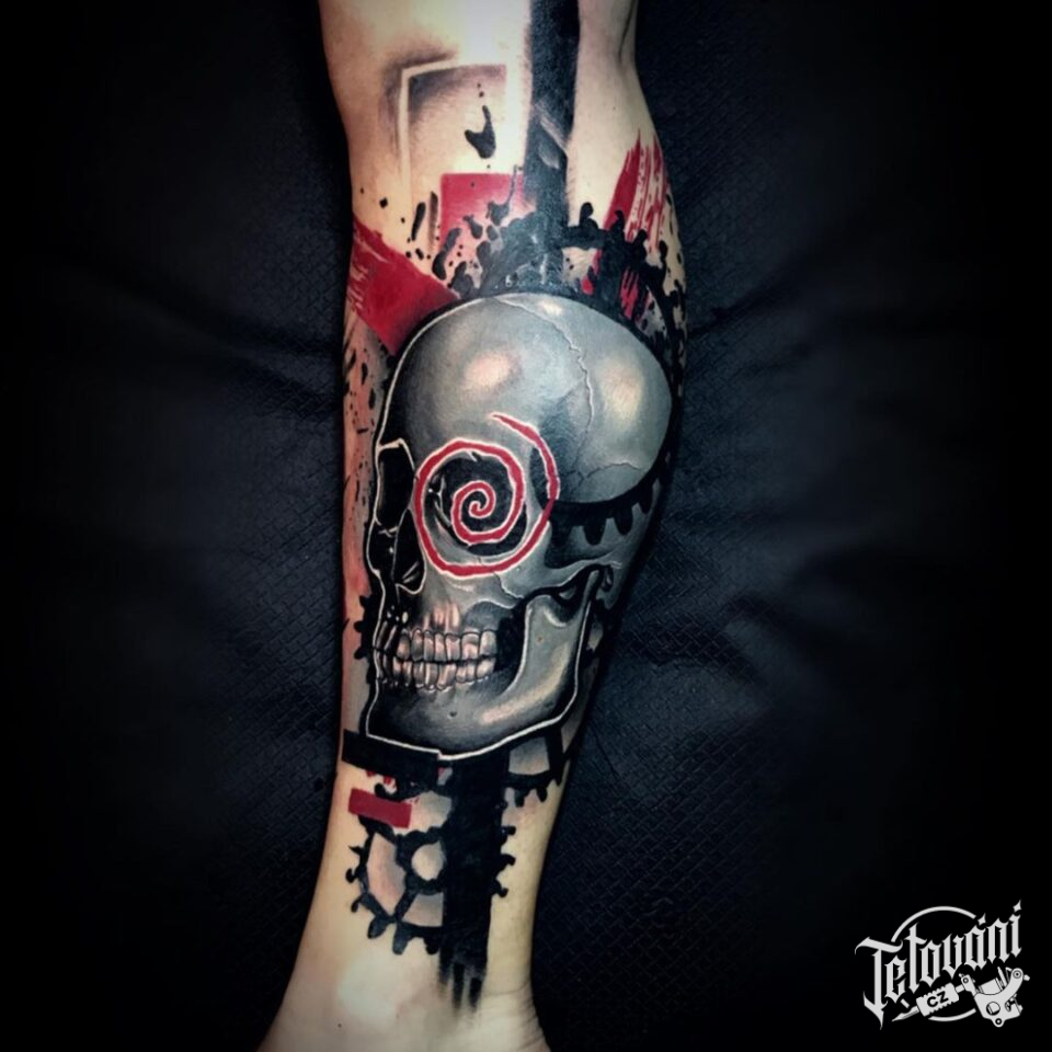 Tetování portrét, lebka, tvary na lýtko