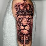 Tetování portrét lva, zvíře s korunou, kříž na rameno