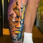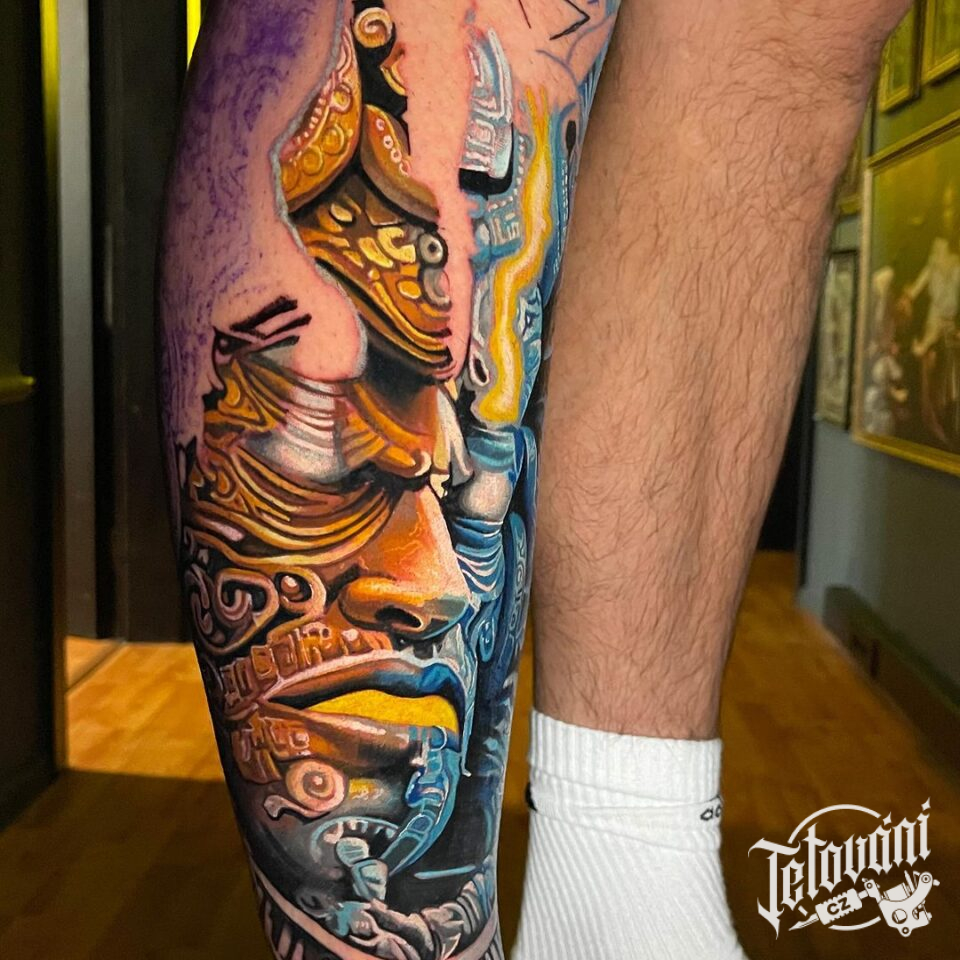 Tetování portrét maska na holeň