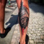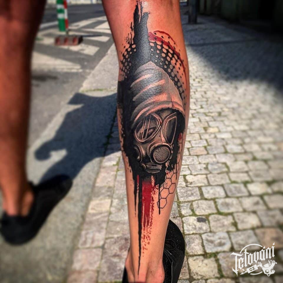 Tetování portrét, maska, tvary na lýtko