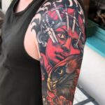Tetování portrét, meče, ruce, zvířata, pták, had a znamení zvěrokruhu váhy na rukávu