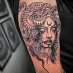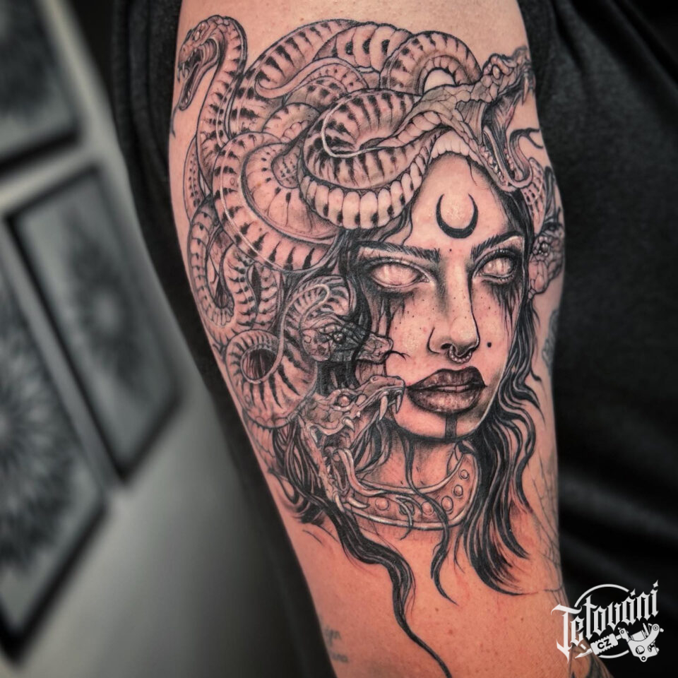 Tetování portrét medúzy, mýtická bytost na na paži