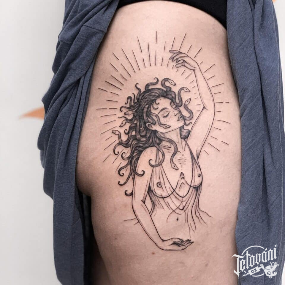 Tetování portrét mýtické Medúzy na boku stehna