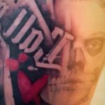Tetování portrét muerte a nápis na boku stehna