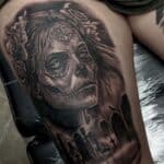 Tetování portrét Muerte na stehno