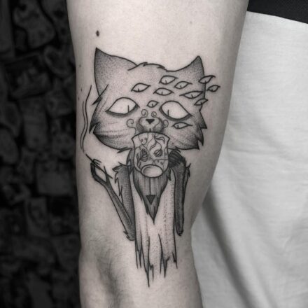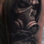 Tetování portrét muž s plynovou maskou symbol smrt na rameno