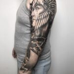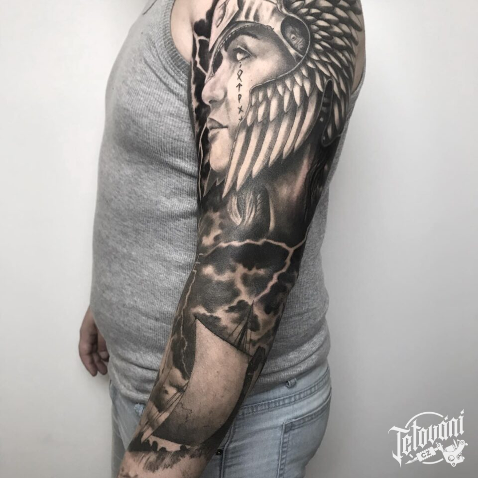 Tetování portrét, mýtická bytost valkýra, dopravní prostředek loď, rukáv