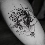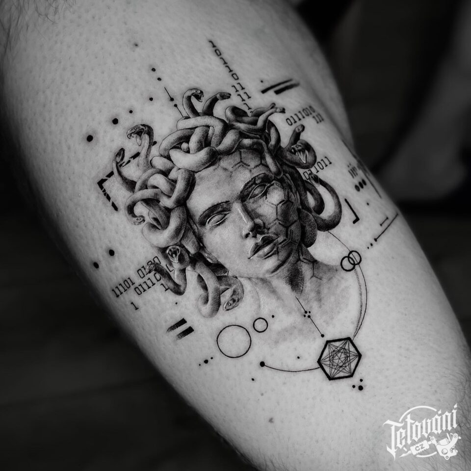 Tetování portrét mýtické bytosti, mýtická Medúza na holeni