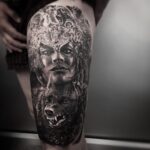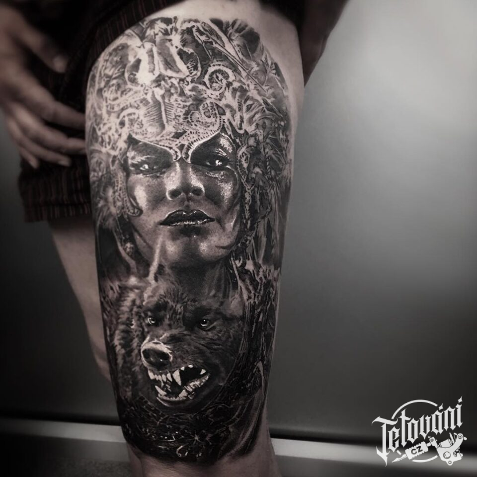 Tetování portrét mýtické bytosti a zvíře vlk na stehně