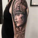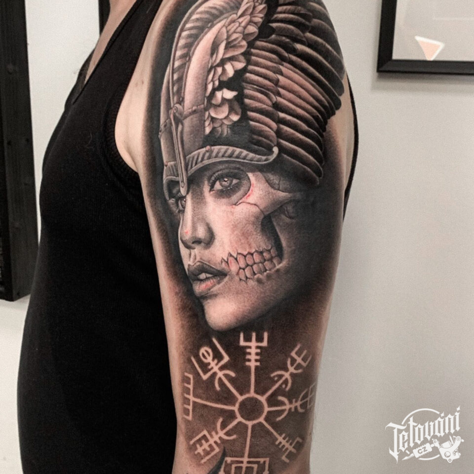 Tetování portrét mýtické bytosti, runa ochranné symboly na rameni