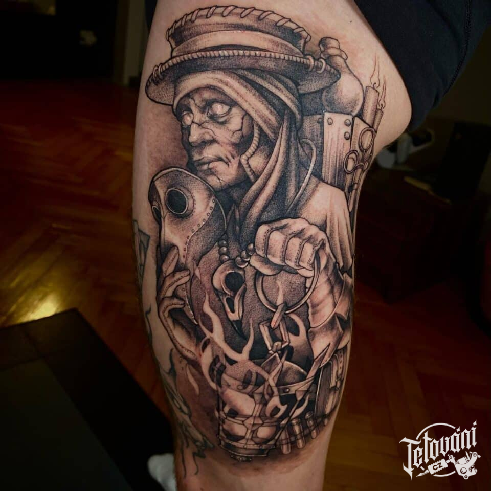 Tetování portrét na boku stehna