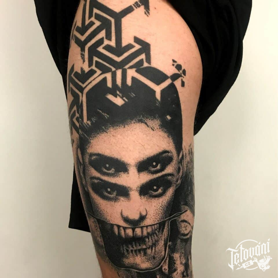 Tetování portrét na boku stehna
