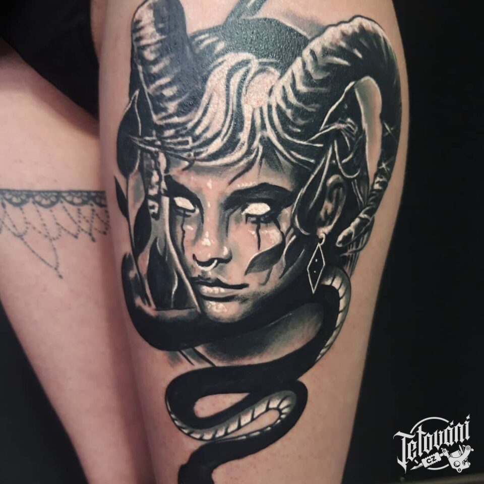 Tetování portrét na stehně