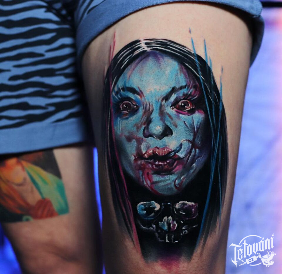 Tetování portrét na stehně