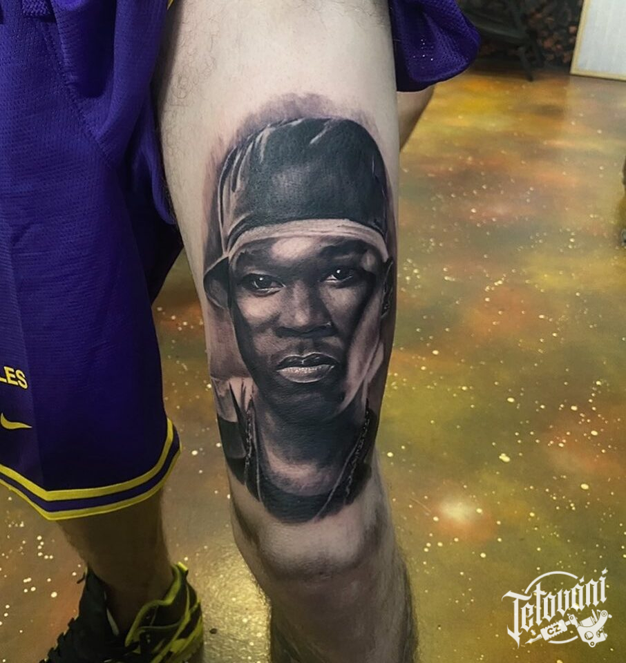 Tetování portrét na stehně