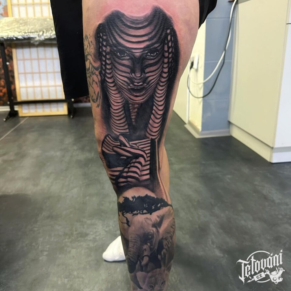 Tetování portrét na stehně