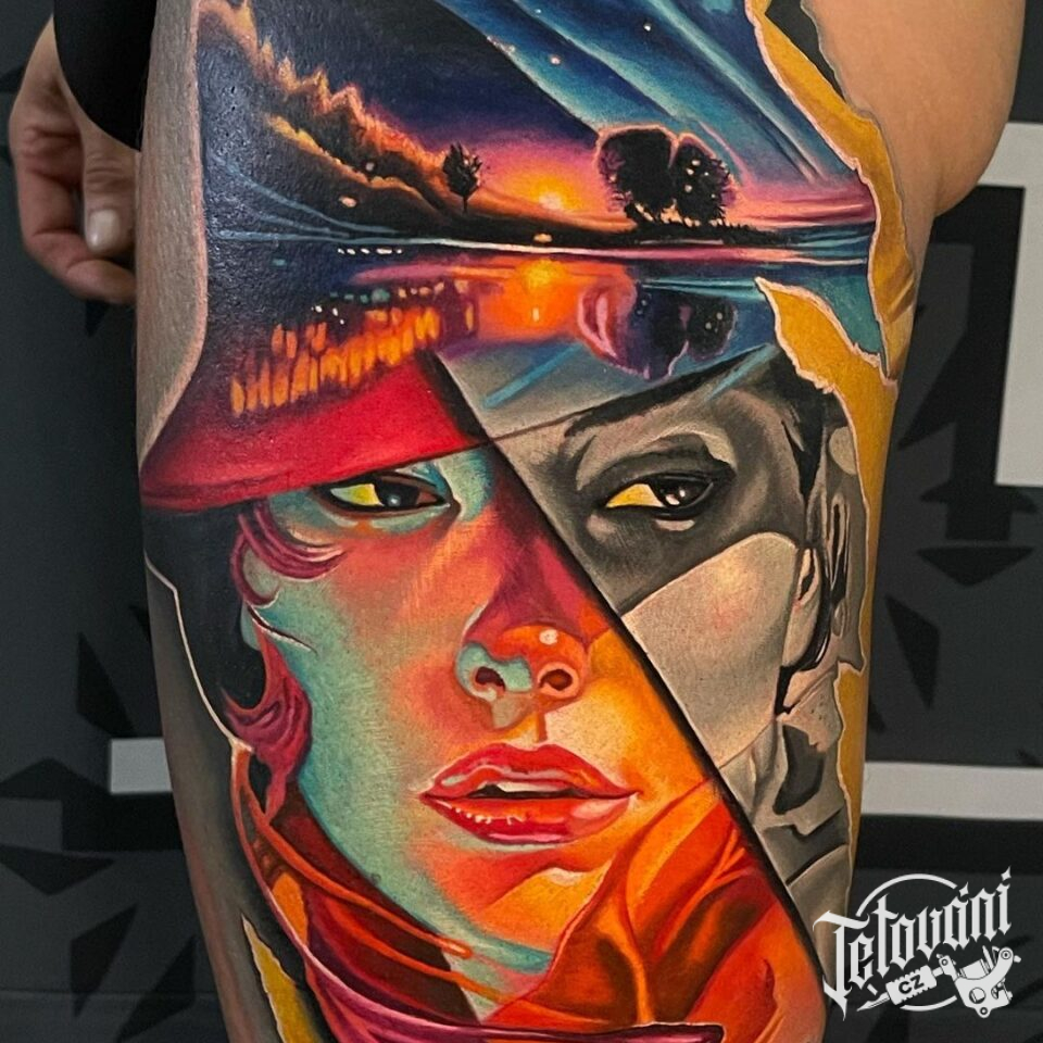 Tetování portrét na stehně