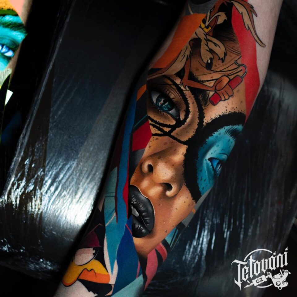 Tetování, portrét obličeje, postavičky z filmů a pohádek na předloktí