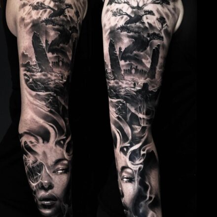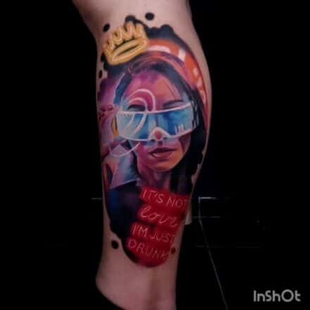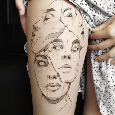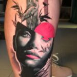 Tetování portrét obličeje, tvary, ptáci, větvička na lýtko