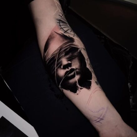 Tetování portrét, oko, čáry, pruhy, tvary na předloktí