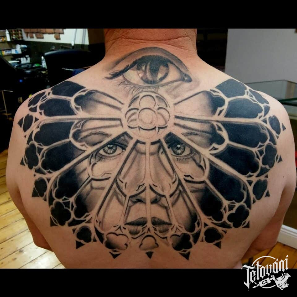 Tetování portrét, oko na zádech