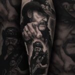 Tetování portrét osobnost LEMMY KILMISTER s kytarou, metal na lýtko